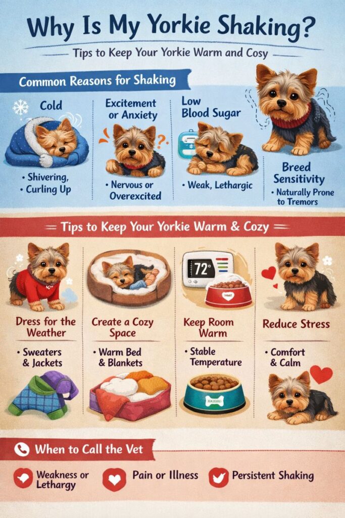 Yorkies are adorable—but their shaking can worry any pet parent. The good news is that shaking is common in Yorkshire Terriers, and it’s often harmless. Here’s how to understand why it happens and what you can do to keep your Yorkie warm, calm, and cozy 🐶❄️